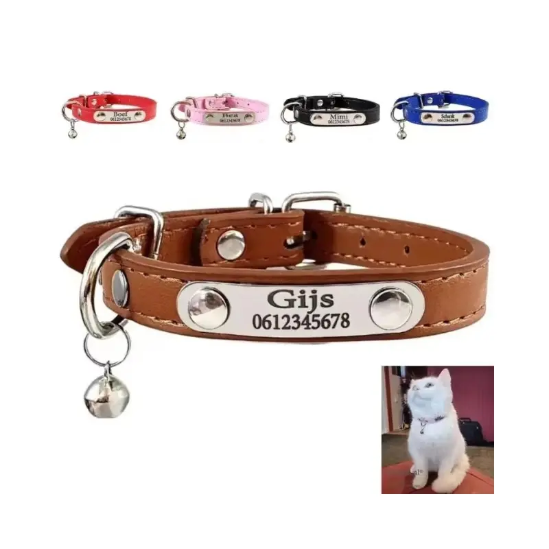 Je kan kiezen uit onze 5 verschillende kleuren halsbandjes voor katten en kitten of honden halsband met naam, roze, blauw, zwart, bruin en rood. Er zit er daarom zeker een gepersonaliseerde kattenhalsband met naam en telefoonnummer graveren bij die past bij je kat of hond past.